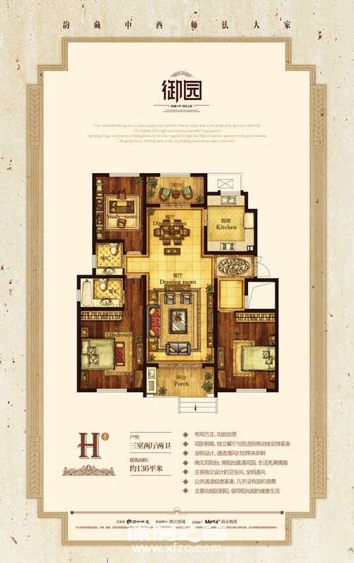H1户型3室2厅2卫 136㎡